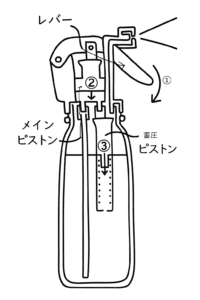 - ポンプ(ピストン):レバーやトリガーを押すとピストンが動き、液体を押し出す。