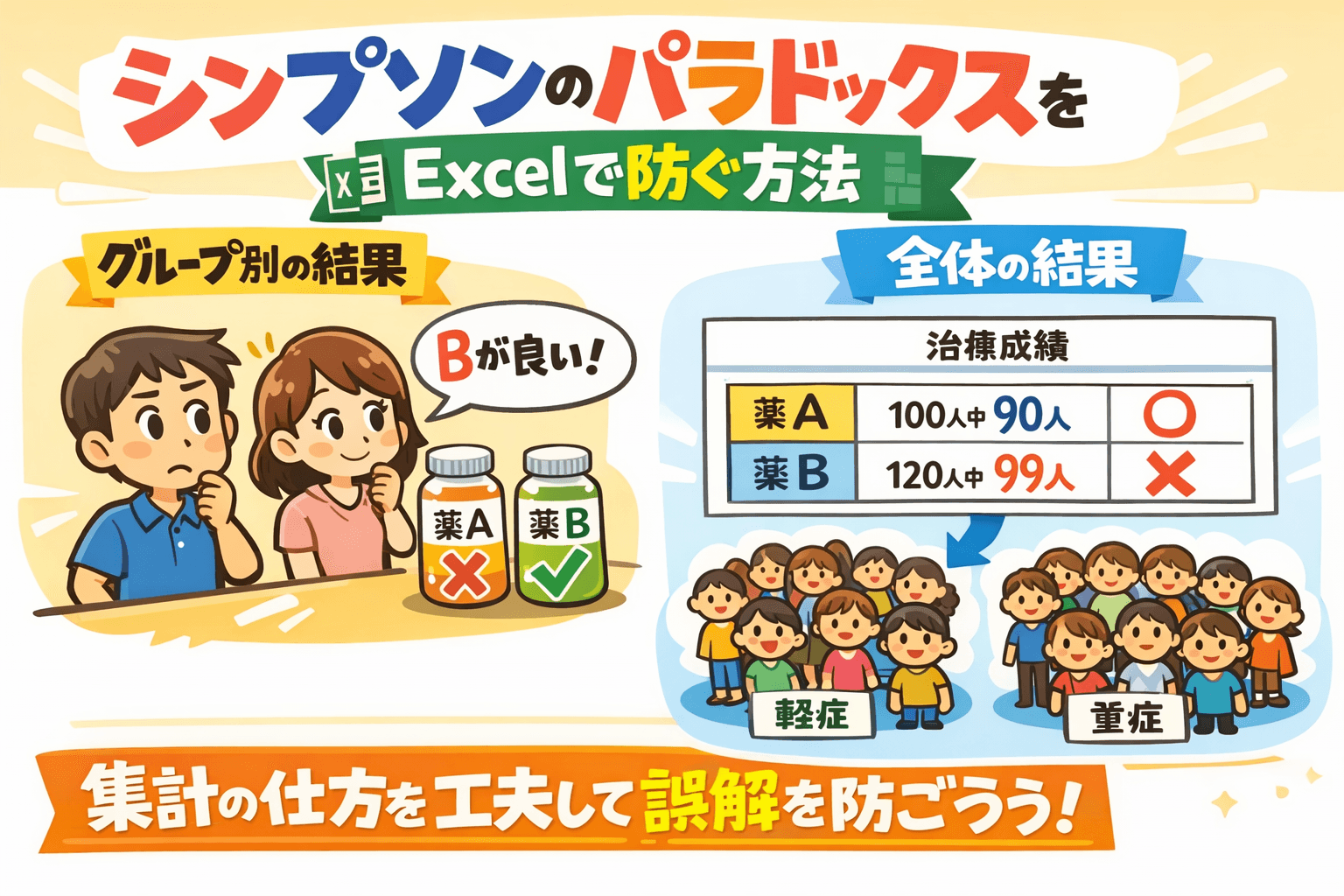 検索キーワード「シンプソンのパラドックス 防ぐ方法」を念頭に、現場で使える実践的な対処法を、Excelの具体例つきで分かりやすくまとめます。